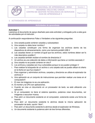 Este documento presenta una guía de aprendizaje sobre reconocimiento de carpetas, archivos y aplicaciones. El objetivo es que los aprendices sean capaces de definir y diferenciar archivos, carpetas y aplicaciones, así como copiar, mover y borrar elementos. La guía incluye actividades como responder preguntas sobre estos temas, crear carpetas y archivos, y seleccionar respuestas sobre software, aplicaciones y tareas con documentos.