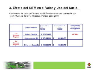 El documento describe el proyecto Megabús en las ciudades de Pereira y Dosquebradas en Colombia. Megabús ha mejorado la movilidad y calidad de vida mediante un sistema de transporte público integrado con rutas troncales y alimentadoras. El proyecto ha generado beneficios ambientales, económicos y sociales como la reducción de emisiones, menores tiempos de viaje, y mayor acceso al transporte para los residentes.