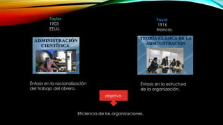 Este documento describe la teoría clásica de la administración de Henri Fayol. Fayol identificó cinco funciones básicas de la administración (planear, organizar, dirigir, coordinar y controlar) y catorce principios generales de la administración. La teoría de Fayol se centró en la estructura de la organización y aumentar la eficiencia a través de la organización, y junto con la administración científica de Taylor estableció las bases de la teoría administrativa moderna.