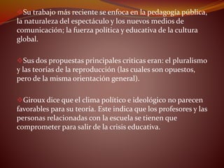 Este documento resume la vida y obra del teórico estadounidense Henry Giroux. Nació en 1943 en Providence, Rhode Island, y es conocido por ser uno de los fundadores de la pedagogía crítica en Estados Unidos. Sus trabajos pioneros se enfocan en áreas como la pedagogía pública, los estudios culturales, los estudios de medios y la teoría crítica. El documento también resume brevemente algunas de las teorías y conceptos clave desarrollados por Giroux, como su teoría de la resistencia educativa y