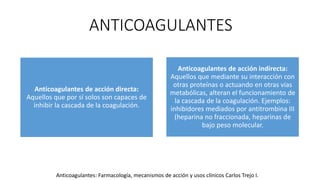 El documento resume la farmacología y usos clínicos de las heparinas en ginecología y obstetricia. Discuten que las heparinas de bajo peso molecular son preferibles a la heparina no fraccionada durante el embarazo y parto, y que pueden usarse para prevenir trombosis venosa en cirugías ginecológicas. También cubre el uso de aspirina para prevenir preeclampsia y pérdidas de embarazo recurrentes.