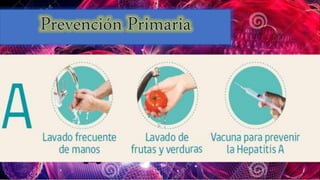 La hepatitis A es causada por el virus de la hepatitis A, el cual se transmite a través de la vía fecal-oral. Las personas en riesgo son aquellas que no han sido infectadas o vacunadas. Los síntomas incluyen malestar estomacal, náuseas y dolor abdominal. No existe un tratamiento específico, solo medidas sintomáticas. La hepatitis A generalmente se resuelve sin secuelas.