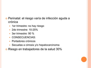 Este documento presenta un resumen de los diferentes virus que pueden causar hepatitis viral, incluyendo sus características, formas de transmisión, manifestaciones clínicas, diagnóstico y tratamiento. Se describen brevemente el virus de la hepatitis A, B, C, D y E, destacando sus diferencias en cuanto a estructura, replicación, síntomas agudos y crónicos, y opciones terapéuticas.