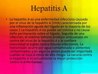 La hepatitis A es una enfermedad infecciosa causada por el virus de la hepatitis A que causa inflamación aguda del hígado. Se transmite principalmente a través del agua o alimentos contaminados. No es crónica ni causa daño permanente. La vacuna ofrece la mejor protección contra la enfermedad.