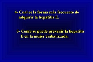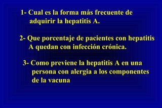 La forma más frecuente de adquirir la hepatitis A es por ingesta de alimentos o agua contaminados. Ningún porcentaje de pacientes con hepatitis A quedan con infección crónica. Para prevenir la hepatitis A en una persona con alergia a los componentes de la vacuna, se puede administrar inmunoglobulina. La forma más frecuente de adquirir la hepatitis E es por ingesta de agua contaminada. Para prevenir la hepatitis E en la mujer embarazada, es importante evitar el consumo de agua no tratada.