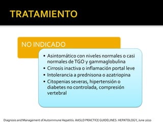 La hepatitis autoinmune es una enfermedad hepática crónica e inflamatoria de causa desconocida caracterizada por la presencia de autoanticuerpos. Se diagnostica mediante hallazgos histológicos, bioquímicos e inmunológicos. El tratamiento consiste principalmente en corticoides e inmunosupresores para prevenir la progresión a cirrosis hepática y la muerte.