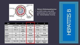 1) El documento describe la hepatitis B, incluyendo su estructura, historia natural de la infección, factores de riesgo, manifestaciones, tratamiento y epidemiología. 2) Explica que la hepatitis B es causada por el virus de la hepatitis B y puede manifestarse como una infección aguda o crónica, poniendo en riesgo la vida si no es tratada. 3) Resalta la importancia de la vacunación y el tratamiento con antivirales directos para reducir las complicaciones graves como la cirrosis y el cáncer hepático.