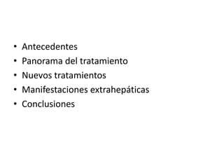 El documento resume información sobre el virus de la hepatitis C (VHC), incluyendo su historia natural, manifestaciones hepáticas y extrahepáticas, y nuevos tratamientos antivirales. Resalta que aproximadamente 185 millones de personas están infectadas con VHC a nivel mundial y que la infección crónica puede conducir a cirrosis y cáncer hepático. Los nuevos tratamientos como los inhibidores de proteasa y sofosbuvir ofrecen altas tasas de curación sin interferón. El control de la infección por VHC puede reducir el riesgo de