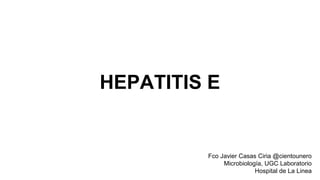 El documento resume la hepatitis E, una enfermedad causada por un virus de RNA monocatenario. Existen 4 genotipos del virus que causan hepatitis aguda y crónica. Se transmite principalmente por el consumo de carne de cerdo mal cocinada o por agua contaminada. El reservorio principal es el cerdo. En países en desarrollo causa brotes y es autolimitada, pero tiene alta mortalidad en embarazadas. En países desarrollados es esporádica y puede ser crónica en inmunodeprimidos. El diagnóstico se realiza