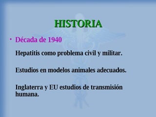 El documento resume la historia de la hepatitis y los descubrimientos clave sobre los virus de la hepatitis A y B. Se describen las características de los virus, su patogenia, cuadros clínicos, epidemiología, diagnóstico y tratamiento. Se destaca que la hepatitis A se transmite por vía fecal-oral y la hepatitis B por contacto con sangre o fluidos corporales. Ambas pueden causar una infección aguda o crónica y su prevención incluye vacunas e higiene.