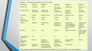 El documento describe las características generales de los principales virus hepatotrópicos. La hepatitis aguda puede ser causada por los virus de la hepatitis A, B, C, D y E y se caracteriza por elevación de transaminasas y síntomas como ictericia. La hepatitis crónica es causada por los virus de la hepatitis B y C y puede progresar a cirrosis o cáncer hepático. Cada virus tiene marcadores serológicos específicos y se recomiendan medidas como vacunación o inmunoglobulina para prevención y tratamiento.