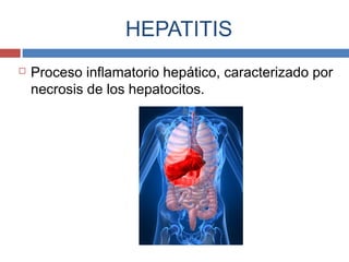 El documento trata sobre las hepatitis virales crónicas. Describe las hepatitis B y C, sus mecanismos de transmisión, manifestaciones clínicas, diagnóstico y tratamiento. La hepatitis viral crónica puede causar cirrosis hepática, hipertensión portal o carcinoma hepatocelular y es la quinta causa principal de muerte a nivel mundial.