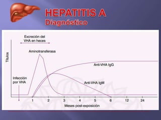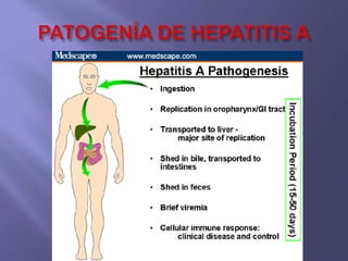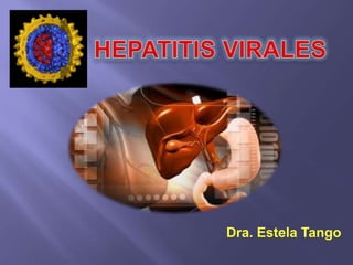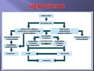 La hepatitis es una enfermedad infecciosa sistémica causada principalmente por varios virus que afectan el hígado y producen inflamación y necrosis de los hepatocitos. Los virus más comunes son los virus de la hepatitis A, B, C, D y E. Cada uno tiene características diferentes de transmisión, periodo de incubación, manifestaciones clínicas, pruebas de diagnóstico y tratamiento.