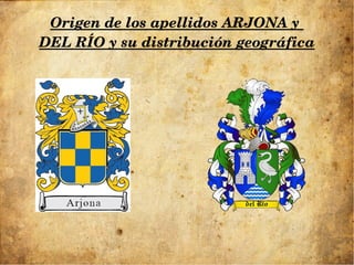 El apellido Arjona tiene su origen en España y es toponímico, derivado del nombre de la localidad de Arjona en Jaén. El apellido Del Río probablemente proviene de Navarra, donde hay lugares llamados Río de Yuso y Río de Suso que pertenecían a un mismo señor, llamado Señor del Río. Ambos apellidos se distribuyen principalmente en España, con una presencia significativa en regiones como Andalucía, Castilla-La Mancha y Navarra.