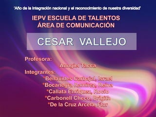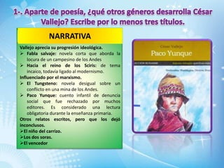 El documento presenta una breve biografía y obra del escritor peruano César Vallejo. Aborda sus principales obras narrativas como "Fabla salvaje" y "El Tungsteno", así como sus piezas teatrales más destacadas como "Lock-out" y "Colacho Hermanos". También menciona sus libros de ensayos "Contra el secreto profesional" y "El arte y la revolución". Finalmente, analiza brevemente el poemario vanguardista "Trilce", señalando su ruptura con las convencion