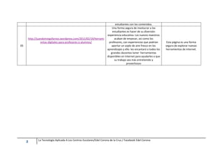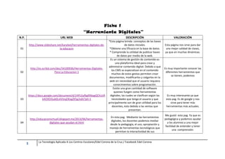 Este documento presenta una lista de 5 sitios web que describen herramientas digitales útiles para docentes. Cada entrada incluye el URL, una breve descripción de la herramienta digital cubierta en el sitio web y una valoración de su utilidad potencial para mejorar la enseñanza. Los sitios web cubren temas como bases de datos educativas, sistemas de gestión de contenido, software educativo clasificado y cómo las herramientas digitales pueden mejorar la comprensión de los estudiantes de manera interactiva.