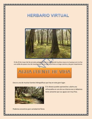 El estudiante describió una excursión escolar al parque Arvi el 29 de mayo donde aprendió sobre las fuentes hidrográficas en el área y pudo ver la gran variedad de flores, y sugirió que los estudiantes podrían refrescarse en los charcos de agua fría o ir en metrocable para una aventura más divertida.