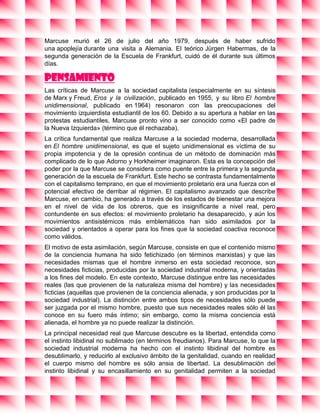 Herbert Marcuse fue un filósofo y sociólogo alemán que formó parte de la Escuela de Frankfurt. Emigró de Alemania en 1933 debido al régimen nazi y se trasladó a Estados Unidos, donde desarrolló gran parte de su obra. Marcuse criticaba la sociedad capitalista avanzada, argumentando que había generado necesidades falsas en las personas a través de los medios de comunicación de masas, eliminando así su capacidad de oposición. Propuso que la verdadera necesidad humana es la libertad, entendida como la liberación del instinto lib