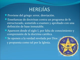 Este documento resume las principales herejías y la apologética a lo largo de la historia de la Iglesia. Define herejía como enseñanzas contra la doctrina católica y apologética como la defensa de la fe a través de argumentos. Detalla varias herejías antiguas como el docetismo, ebionismo y gnosticismo que surgieron en el siglo I, así como herejías posteriores como el arrianismo, nestorianismo y cátaros.