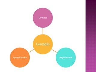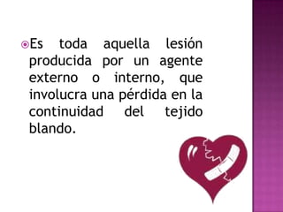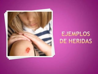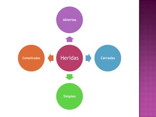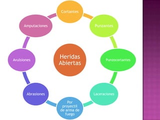 Este documento describe diferentes tipos de heridas, incluyendo simples, complicadas, abiertas, cerradas, cortantes, punzantes, laceraciones, abrasiones, avulsiones y amputaciones. Explica el manejo de primeros auxilios para heridas leves, graves y que ponen en riesgo la vida como heridas en el tórax, abdomen, cráneo y doble penetrantes. Resalta la importancia de detener hemorragias, limpiar heridas y buscar atención médica para heridas graves.