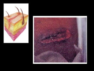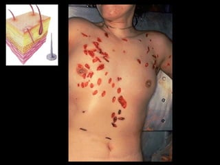 El documento proporciona instrucciones para el tratamiento de diferentes tipos de heridas, incluyendo abrasiones, cortes, laceraciones, avulsiones, punzocortantes y heridas de arma de fuego. Recomienda lavar y desinfectar las heridas, unir los bordes con cinta adhesiva cuando sea posible, y cubrirlas con gasas y vendajes. Para objetos impactados, indica no retirarlos, inmovilizarlos y controlar la hemorragia. Para amputaciones, aconseja enjuagar la parte amputada, envolverla en