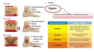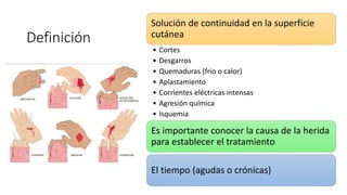 Este documento describe las manifestaciones clínicas y biológicas de las heridas. Explica que las heridas pueden clasificarse como abiertas o cerradas dependiendo de si hay una abertura en la piel. También describe los grados de heridas como simples o complejas dependiendo de la profundidad de los tejidos afectados. Además, explica las fases de la cicatrización de heridas que incluyen inflamación, proliferación y remodelación. Por último, brinda información sobre el tratamiento de heridas leves y graves que puede requer