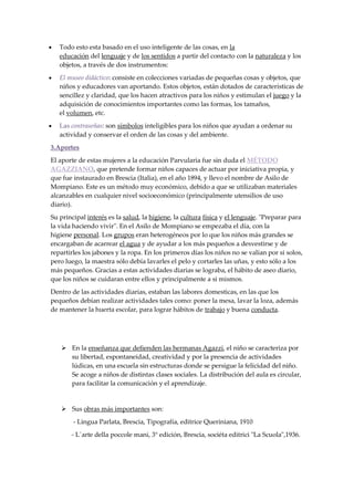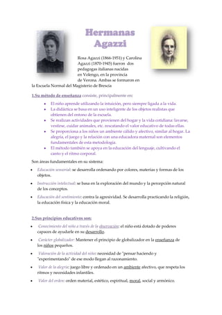 Este documento describe el método educativo desarrollado por las hermanas Rosa y Carolina Agazzi en la escuela de Mompiano en Italia en 1894. Su método se centraba en el aprendizaje a través de la intuición y actividades prácticas como tareas domésticas. Creaban un ambiente cálido y afectivo similar al hogar donde primara la alegría, el juego y la relación con las maestras.