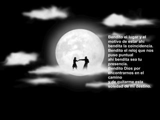 Bendito el lugary el motivo de estar ahí bendita la coincidencia. Bendito el reloj que nos puso puntual ahí bendita sea tu presencia. Bendito Dios por encontrarnos en el camino y de quitarme esta soledad de mi destino.