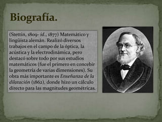 Hermann Grassmann fue un matemático y lingüista alemán nacido en 1809. Realizó importantes contribuciones a campos como la óptica, acústica y electromagnetismo, pero destacó principalmente por su trabajo pionero en geometría multidimensional y el desarrollo del cálculo de magnitudes extensivas. Su obra más influyente fue la Teoría de la Extensión publicada en 1862, considerada fundacional para el álgebra lineal y multilineal modernas. También se dedicó al estudio de lenguas como el sánscrito y public