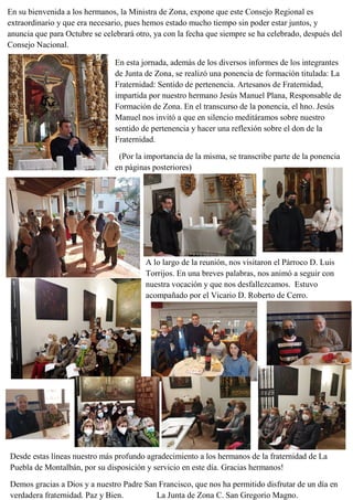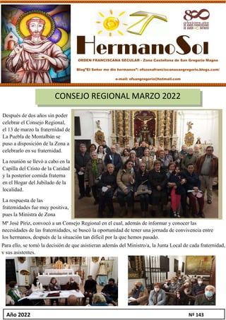 El documento describe las actividades del Consejo Regional de la Orden Franciscana Secular en marzo de 2022, incluyendo una ponencia sobre el sentido de pertenencia a la fraternidad. Varias fraternidades locales celebraron elecciones para cargos en su junta. La reunión regional buscó fomentar la convivencia entre los hermanos después de dos años sin poder reunirse debido a la pandemia.