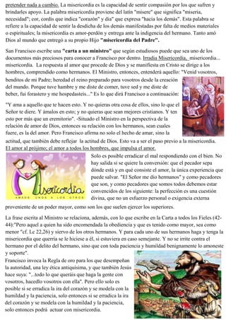 El documento habla sobre la misericordia según San Francisco de Asís. San Francisco enfatizaba la necesidad de predicar el Evangelio con una vida coherente y de ser testigos valientes de Cristo. También promovía el amor y la misericordia hacia los demás, especialmente entre los hermanos franciscanos. La misericordia no es un acto individual sino comunitario y conduce a la unidad dentro de la Iglesia.