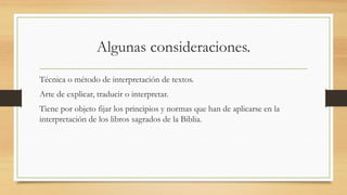 El documento habla sobre hermenéutica bíblica. Explica que la hermenéutica es la técnica o método de interpretación de textos, especialmente los textos bíblicos. Luego, presenta 11 reglas de hermenéutica bíblica, como tomar las palabras en su sentido usual, considerar el contexto del pasaje, interpretar a la luz de pasajes paralelos, y distinguir las realidades como Dios lo hace. Finalmente, incluye ejemplos de cómo aplicar estas reglas al interpretar pasajes bíblicos.