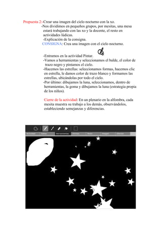 El documento presenta dos propuestas para una clase de astronomía sobre los elementos del cielo nocturno para estudiantes de 4to grado. La primera propuesta involucra identificar los elementos a través de imágenes e interrogantes. La segunda propuesta involucra crear una imagen del cielo nocturno usando un programa de dibujo, dividiendo a los estudiantes en grupos para trabajar.
