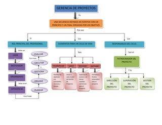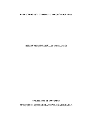 El documento habla sobre la gerencia de proyectos de tecnología educativa. Explica que un proyecto es una secuencia definida de eventos con un principio y final dirigidos por un objetivo. Describe que el rol principal del gerente de proyectos es ser organizado, motivador y tener experiencia. Además, explica que el ciclo de vida de un proyecto incluye las fases de planificar, ejecutar, gestionar y evaluar.