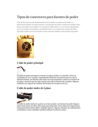 Este documento describe los diferentes tipos de conectores que se encuentran comúnmente en las fuentes de poder modernas, incluyendo el cable de poder principal de 20 o 24 pines, los cables molex de 4 pines, los cables SATA de 15 pines para discos duros, los cables PCI-Express de 4, 8 o 12 pines para tarjetas gráficas, y conectores auxiliares como el ATX12V de 4 pines para el procesador. En total, las fuentes de poder pueden tener hasta una docena de diferentes cables y conectores para alimentar los diversos componentes