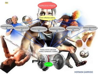 El documento describe los beneficios del ejercicio físico moderado para los sistemas circulatorio, respiratorio y muscular, así como para prevenir enfermedades. Sin embargo, señala que un ejercicio excesivo o sin la técnica adecuada puede causar lesiones. Recomienda actividades aeróbicas de baja intensidad de 15 a 60 minutos, 3 veces por semana, evitando actividades de alto impacto o intensidad.