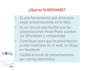 Este documento describe y compara las herramientas SlideShare y Prezi. SlideShare permite compartir presentaciones de PowerPoint en línea, mientras que Prezi crea presentaciones no lineales que se asemejan a mapas mentales. Ambas herramientas facilitan la transmisión de información y conocimiento de forma accesible. Mientras que SlideShare se enfoca en compartir presentaciones en diapositivas, Prezi ofrece más opciones creativas para expresarse.