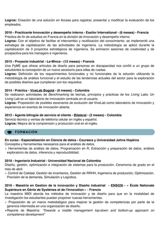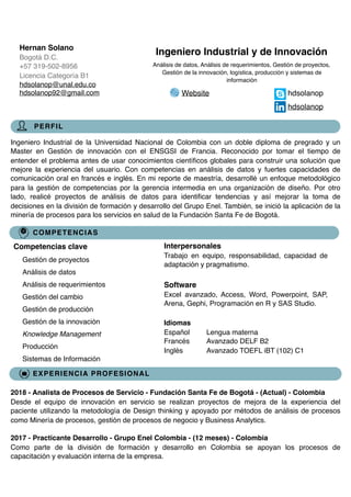 Este documento presenta el perfil profesional de un ingeniero industrial colombiano con una maestría en gestión de la innovación. Cuenta con experiencia en análisis de datos, gestión de proyectos e implementación de metodologías de diseño centrado en el usuario para mejorar procesos y la experiencia del paciente en el sector salud. Actualmente trabaja como analista de procesos de servicio en una fundación hospitalaria en Bogotá.
