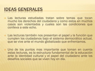 La educación ciudadana y la cohesión social se ven afectadas por la des-subjetivación del sistema, lo que genera desafíos. La subjetividad y la identidad de los ciudadanos pueden cambiar debido a factores sociales, políticos y económicos, afectando la participación ciudadana. También, el sistema democrático y las políticas neoliberales han debilitado la democracia y la cohesión social. Por lo tanto, es importante que la educación desde la infancia promueva la inclusión social y la construcción de una ciudadanía activ