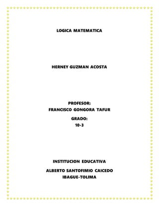 La lógica matemática estudia los sistemas formales y cómo codifican nociones matemáticas usando lenguaje formal. Se divide en teoría de modelos, teoría de la demostración, teoría de conjuntos y teoría de la recursión. En matemáticas, una proposición puede ser verdadera o falsa pero no ambas, y los conectivos lógicos como la negación, conjunción y disyunción conectan proposiciones. Los métodos de demostración incluyen métodos directos, indirectos y por inducción