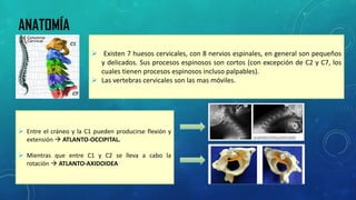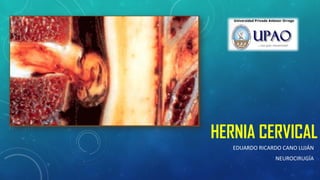 Este documento describe la anatomía, síntomas, diagnóstico y tratamiento de las hernias cervicales. Explica que estas ocurren cuando el núcleo pulposo de un disco intervertebral se protruye a través del anillo fibroso, presionando los nervios cervicales. Los síntomas incluyen dolor en el cuello y brazo que empeora con movimiento. La resonancia magnética y la tomografía computarizada ayudan al diagnóstico. El tratamiento puede ser conservador o quirúrgico mediante discectomía o fusión