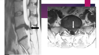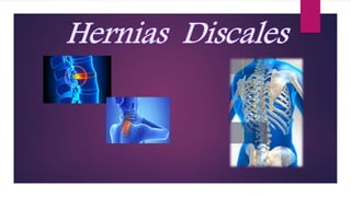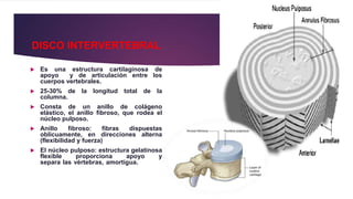 El disco intervertebral consta de un anillo fibroso que rodea el núcleo pulposo gelatinoso. Proporciona apoyo y separación entre las vértebras, amortiguando los golpes y permitiendo el movimiento. Una hernia discal ocurre cuando el material del núcleo pulposo se extruye a través del anillo fibroso, comprimiendo los nervios cercanos y causando dolor. Se diagnostica mediante TAC o resonancia magnética, y su tratamiento incluye analgésicos, fisioterapia y, en algunos