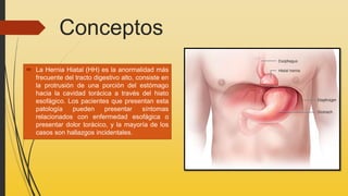 La hernia hiatal es la anormalidad más frecuente del tracto digestivo alto y consiste en la protrusión del estómago a través del hiato esofágico en el diafragma. Puede causar síntomas como reflujo gastroesofágico o complicaciones como sangrado. El diagnóstico se realiza mediante endoscopia, radiografía o manometría. El tratamiento quirúrgico involucra la reparación del defecto diafragmático y adición de una fundoplicatura para prevenir el reflujo, reduciendo la tasa