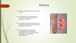 Este documento describe la historia, epidemiología, anatomía, clasificación, etiología, manifestaciones clínicas y tratamiento de la hernia inguinal. La hernia inguinal ha sido documentada desde el 1500 a.C. y la primera reparación quirúrgica data del siglo I d.C. Afecta principalmente a hombres y su incidencia aumenta con la edad. Existen varias clasificaciones anatómicas de hernias inguinales. El tratamiento es quirúrgico para aliviar síntomas y prevenir complicaciones como la incarcer