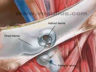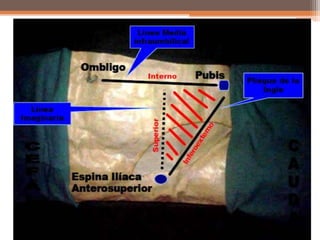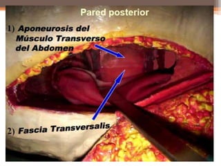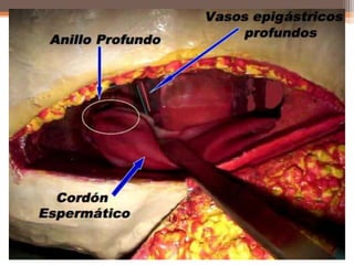 Este documento trata sobre la hernia inguinal, incluyendo su anatomía, fisiopatología, clasificación, diagnóstico y tratamiento. Una hernia inguinal ocurre cuando una estructura abdominal se protruye a través de un debilitamiento en la pared abdominal en la ingle. Puede ser directa o indirecta dependiendo de su localización y contenido. El diagnóstico se realiza clínicamente mediante examen físico. El tratamiento principal es la hernioplastía con malla para reparar la pared abdominal.
