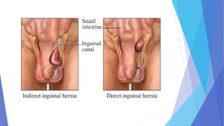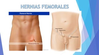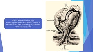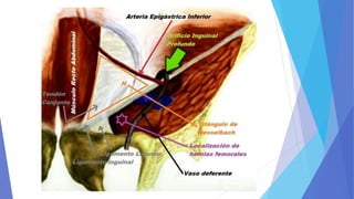 - La hernia inguinal indirecta sobresale hacia afuera y adelante, situándose medial al anillo inguinal interno y los vasos epigástricos inferiores. La hernia inguinal directa sobresale a través del defecto de la pared posterior en la región inguinal. Las hernias femorales sobresalen inferior al ligamento inguinal a través del triángulo de Hesselbach.