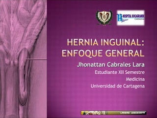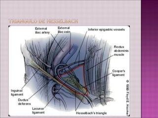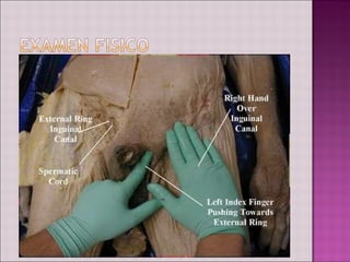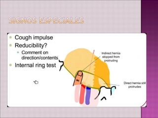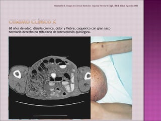 1) El documento describe una hernia inguinal en un paciente de 68 años que presenta dolor, fiebre y disuria crónica.