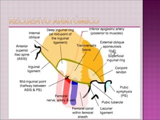 2) Explica las características anatómicas de la región inguinal y los tipos más comunes de hernia, siendo la hernia inguinal indirecta la más frecuente.