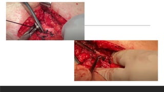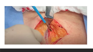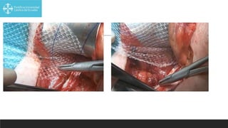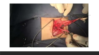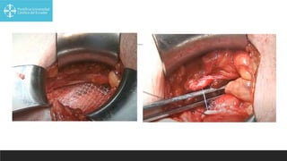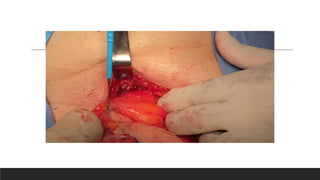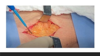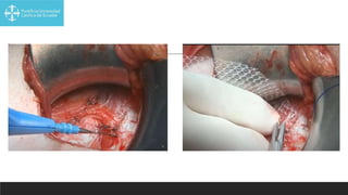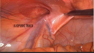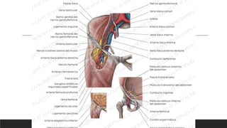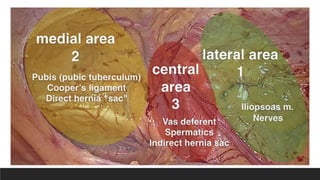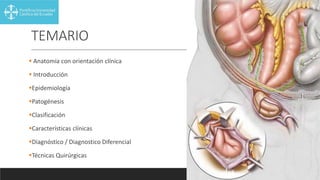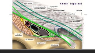 Este documento presenta información sobre la hernia inguinal, incluyendo su anatomía, epidemiología, clasificación, síntomas, diagnóstico y técnicas quirúrgicas de reparación. Cubre temas como la incidencia más alta en hombres, factores de riesgo como la edad y antecedentes familiares, clasificación en directa e indirecta, exámenes como eco y resonancia, y métodos quirúrgicos como los de Bassini, Shouldice, Lichtenstein y laparoscópico.