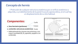 Esta hernia inguinal se produce por la protrusión de tejido a través de la pared posterior del canal inguinal. Puede ser indirecta, directa o femoral. El diagnóstico se realiza mediante examen físico y confirmado con ecografía o resonancia magnética. El tratamiento incluye manejo conservador para hernias asintomáticas o quirúrgico mediante técnicas de reparación abierta o laparoscópica usando malla, para reducir las recidivas.